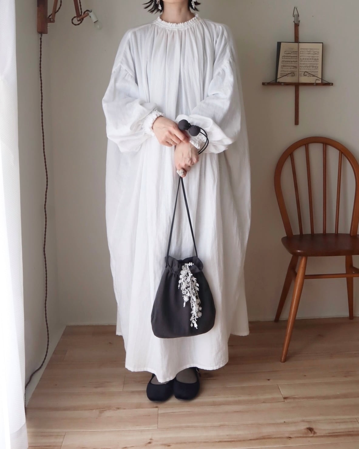 首元と袖口にぎゅっと寄せた、やわらかなギャザー。